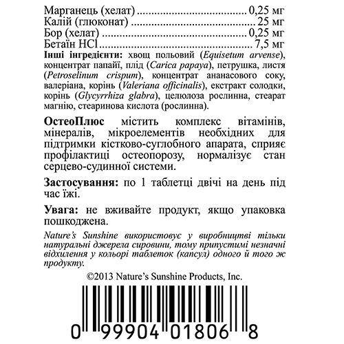 Остео Плюс содержит витамины: D, В6, В12, помогающие восстанавливать коллаген, биоэлементы: кальций, магний, фосфор, железо, цинк, марганец, медь, бор, участвующих в формировании костной ткани. В состав препарата входят: 15 мг хвоща, по 7,5 мг папайи, петрушки, ананаса, валерианы, 1,6 мг экстракта солодки, бетаин.