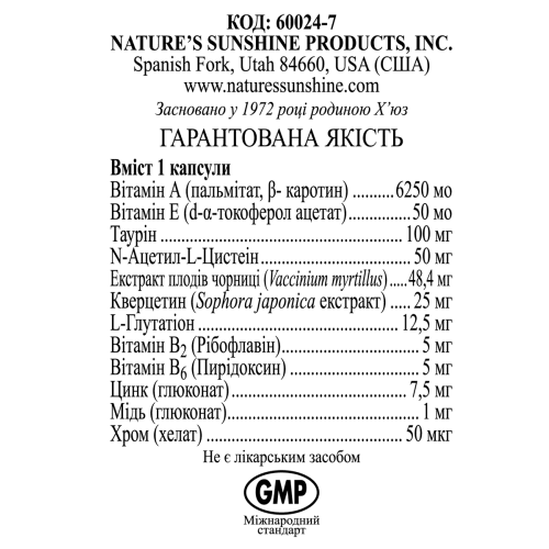 Экстракт сока черники (Vaccinium myrtillus) – стимулирует выработку зрительного пигмента родопсина и обладает сильным антиоксидантным действием, что значительно повышает остроту и расширяет поле зрения, снижает усталость глаз, ускоряет обновление клеток сетчатки. Янтарная кислота, которой много в чернике, способствует сохранению эластичности стенок кровеносных сосудов.
